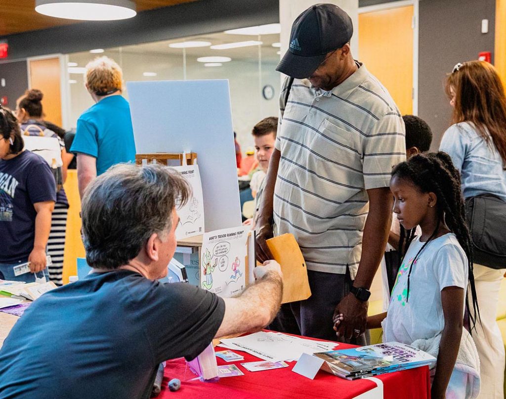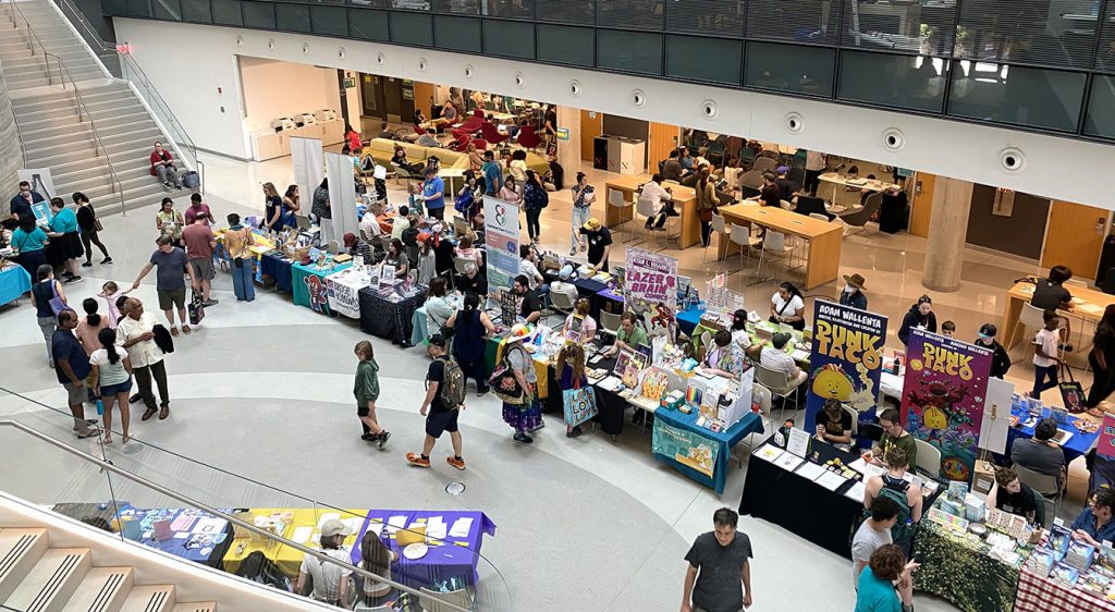 The 2024 Boston Kids Comics Fest was held in the central atrium of Northeastern University’s Interdisciplinary Science & Engineering Complex. Open to all six floors above and a hypnotizing spiral staircase, it’s an amazing area with so much light and space. Now fill that with a wonderful, constant, enthusiastic crowd full of so many kids (and parents & other adults) who genuinely wanted to see comics. Result? I had the absolute best time, talking to folks about comics in general and my story in particular.