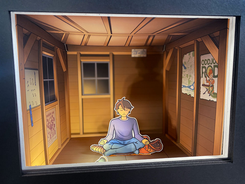 And what a surprise hit my spontaneous display concept turned out to be! In the days before the convention I cooked up the strange idea to craft a diorama box of a key scene from my story, where main character Trevor goes back to his old tree-fort to meditate (trust me; it’s a big moment). I almost abandoned it when I worried it was cheesy, but ultimately kept going… and I’m so glad I did. This lit-up, cut-out diorama cube lured curious passers-by to my table, and from there we’d start chatting!