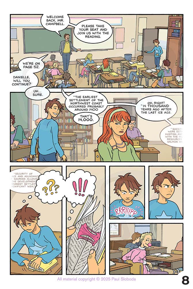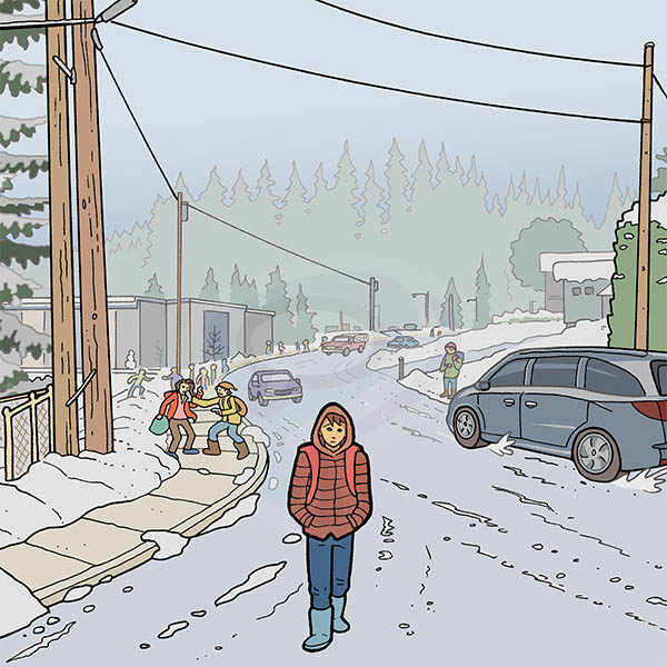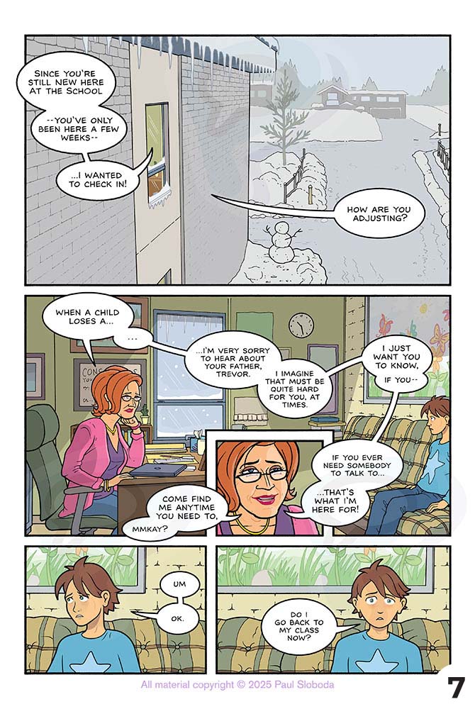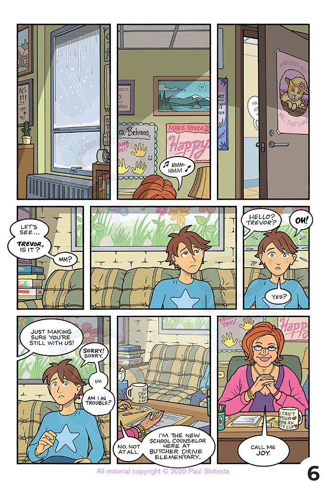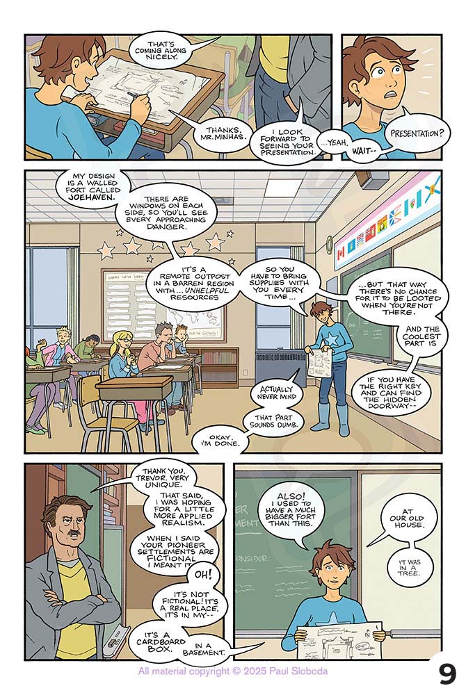 Trevor copes by escaping — getting lost in his dad’s old comics, daydreaming of the past, even meditating in his new fort: a cardboard box in the laundry room!